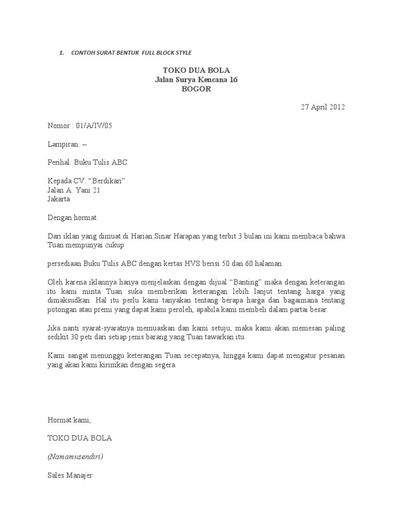 Untuk penulisan pada alamat surat pun bentuk penulisannya tidak sama atau bentuknya harus menyerupai tangga. Contoh surat permintaan daftar harga block style full kumpulan lengkap pesanan barang atk obat dan dalam bahasa inggris bentuk. Contoh surat pesanan secara kredit. Surat lamaran kerja dalam bahasa inggris yang baik dan benar. 007 contoh business letter formal. Dalam hal ini anda pun bisa menggunakan surat pesanan block style untuk keperluan tersebut. Kami sangat menunggu keterangan tuan secepatnya, hingga kami dapat mengatur pesanan yang akan kami kirimkan. Pada dasarnya mirip dengan surat full block style namun ada perbedaan pada penulisan penempatan tanggal, nama instansi, salam penutup,, nama jelas dan nama jabatan, dimana pada surat bentuk block style (lurus). Seperti halnya dengan surat resmi, dimana menggunakan bahasa yang formal dan sopan. Surat yang juga disebut sebagai surat bentuk lurus ini merupakan kombinasi dari bentuk surat full block style dan semi block style. Surat block style disebut juga dengan surat bentuk lurus. Penulisan surat bentuk ini hampir sama dengan bentuk full block style (lurus penuh) yaitu nomor, alamat tujuan, salam pembuka. Contoh surat pesanan bentuk full block style.